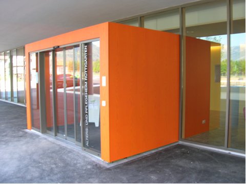 Eingangskubus verkleidet mit wasserfesten Eschen-Platten, eingefärbt und lasiert.