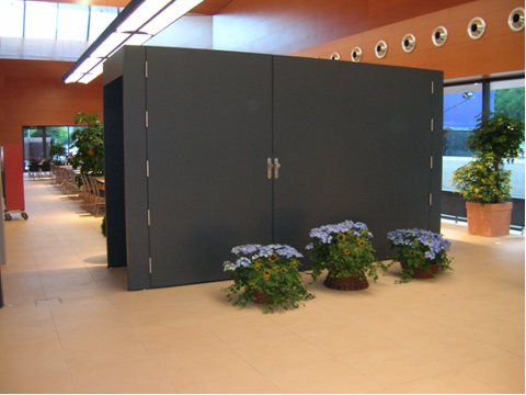 In MDF gestrichen. Beim Öffnen der Türen wird der Raum Unterteil und abgeschlossen. Das Innenleben des Raumteilers kann anderweitig genutzt werden.