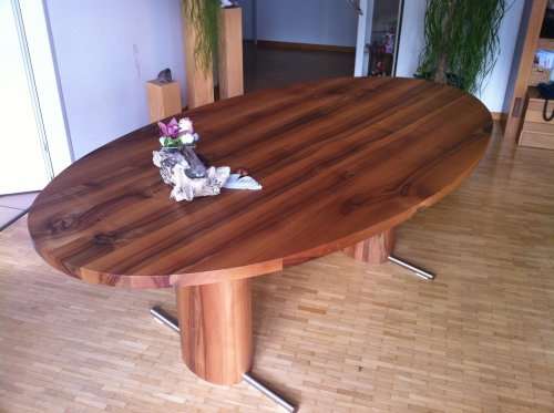 Ellipsenförmiger Nussbaumtisch massiv, geölt.