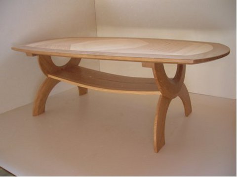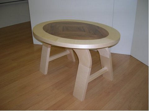 Ellipsen-Salontisch aus Ahorn massiv mit Nussbaum-Kreuzfuge furniert.